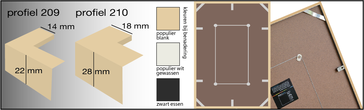 Lijsten bestellen bij ArtSuppliesPro is heel eenvoudig. Onder de afbeelding staat: kies een afmeting, kies een profiel en kies een kleur (populier, populier wit gewassen en zwart essen).